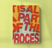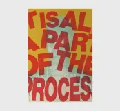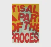 "La phrase 'IS ALL A PART OF THE PROCESS' est disposée dans une mise en page dynamique et légèrement chaotique avec une typographie rouge en détresse sur un fond jaune texturé, avec une silhouette subtile derrière le texte. La texture rugueuse et les formes imparfaites des lettres créent un sentiment d'authenticité et de résilience",
