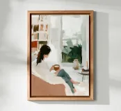 Ce poster numérique serein capture un moment de contemplation tranquille près d'une grande fenêtre. Une femme, représentée dans un style simple et élégant, est confortablement assise sur un canapé, tenant une tasse de café chaud et contemplant un paysage vert abstrait. L'œuvre se caractérise par une palette sophistiquée de tons neutres et de terre - blancs crémeux, terre cuite douce, marron et vert sauge - accentuée par une étagère stylisée. Les coups de pinceau visibles et épais confèrent une texture riche à l'ensemble de la scène. Ce téléchargement numérique de haute qualité (7000x5000 pixels, 300 dpi) est parfait pour ajouter une touche d'originalité à votre image.