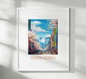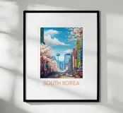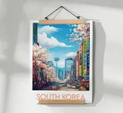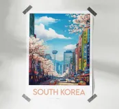 Plongez au cœur de l’effervescence urbaine avec cette affiche de la Corée du Sud, illustrant une rue animée bordée de cerisiers en fleurs et de bâtiments modernes. Un mélange vibrant de tradition et de vie citadine pour sublimer votre déco.