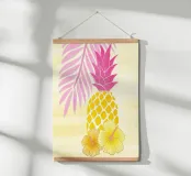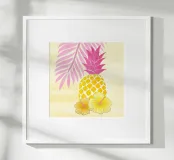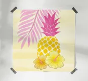 Design cool en jaune et rose vifs avec des accents dorés. Ananas avec des fleurs d'hibiscus et des palmiers ainsi que des fleurs de plumeria et des coquillages. Ton must-have pour l'été.