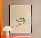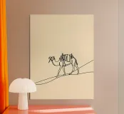 Dessin au trait minimaliste d'un chameau dans le désert, capturant la beauté des dunes et l'essence du voyage nomade. Parfait pour les amoureux de la nature et les décors inspirés par l'aventure.