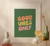 Infusez de la positivité dans votre espace grâce à cette typographie vibrante. La phrase édifiante "Good Vibes Only" prend vie dans un lettrage joyeux orange, jaune et rose dessiné à la main, sur un fond vert vintage. Cette œuvre accrocheuse associe un charme rétro à un message moderne, créant ainsi un mélange parfait de nostalgie et d'optimisme. Idéale pour ajouter une touche de couleur et de positivité à n'importe quelle pièce, qu'il s'agisse d'un salon ou d'un bureau à domicile, cette œuvre d'art ne manquera pas d'égayer votre humeur et de vous inspirer une bonne énergie. Laissez cet imprimé ludique donner le ton d'un mode de vie plus heureux et plus dynamique.