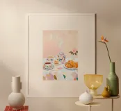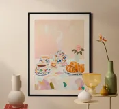 Illuminez votre espace avec cette charmante et fantaisiste nature morte impressionniste. L'œuvre capture un petit déjeuner ou un thé parisien accueillant, avec une théière fumante et des tasses assorties ornées d'un joyeux motif floral multicolore. La composition comprend des croissants fraîchement cuits, un macaron à la framboise et une délicate rose, le tout sur un fond apaisant rose et crème. Les coups de pinceau visibles donnent à la pièce une texture douce et picturale et une élégance douillette. Cet achat correspond à un fichier d'affiche numérique de qualité supérieure (7000x5000 pixels, 300 dpi), garantissant un rendu irréprochable et sans fioritures.
