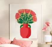 Un vase rouge vif aux courbes élégantes contient un bouquet dense et luxuriant de fleurs stylisées roses et rouges, présenté dans une composition nette et moderne.