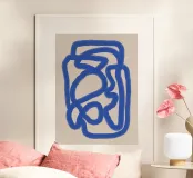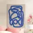 Une ligne bleue épaisse serpente sur un fond neutre, créant un motif abstrait aux formes audacieuses et curvilignes. La simplicité du dessin met en valeur le mouvement et le flux de la ligne continue.