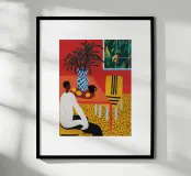 Scène d'une personne assise sur un tapis imprimé léopard, entourée de plantes et de livres. La composition est une célébration colorée et éclectique de la contemplation tranquille dans un espace vibrant, moderne et personnalisé.