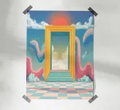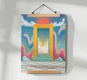 Un escalier turquoise mène à une porte monumentale ouverte sur un ciel de nuages et de lumière. Ce visuel surréaliste, baigné de teintes pastel et d’ondes psychédéliques, évoque le rêve, la méditation et le voyage intérieur. Parfait pour créer une atmosphère inspirante et céleste. Ce design est une invitation à franchir les frontières de l’imaginaire. Idéal pour les amateurs d’art visionnaire, de spiritualité visuelle et de paysages abstraits.