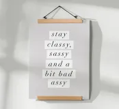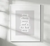 Ajoutez une touche d'audace et de sophistication à votre espace avec cette impression typographique chic. La phrase "Stay Classy, Sassy and a Bit Bad Assy" (Restez classe, insolent et un peu mauvais) est élégamment rendue en lettres à empattement, créant un design frappant en niveaux de gris sur un fond gris doux. Cette pièce à la mode allie attitude et raffinement, et est parfaite pour ajouter une dose de confiance à votre bureau, votre chambre à coucher ou votre espace de vie. Idéale pour ceux qui apprécient un peu d'audace dans leur décoration, cette impression sert de rappel quotidien pour embrasser votre personnalité à multiples facettes. Un cadeau idéal pour vos amis ou pour vous faire plaisir.