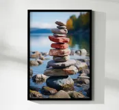 Créez avec l'IA une tour en pierre avec une ambiance apaisante au bord d'un lac de montagne dans la forêt. L'image en pierre ou le bonhomme en pierre décore chaque mur de ta maison.