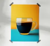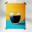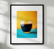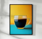 Illustration minimaliste d’une tasse transparente remplie de café noir sur une surface turquoise avec un fond jaune éclatant. Une affiche parfaite pour apporter élégance et énergie à la décoration de votre cuisine.