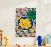 Illustration graphique épurée d'un bol bleu rempli de citrons jaune vif, posé sur une nappe à carreaux bleus et blancs, créant une scène fraîche et joyeuse.