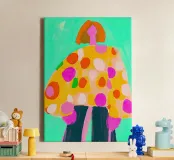 Une figure Pop Art Maximaliste vibrante et recadrée mettant en valeur la mode audacieuse et les couleurs expressives. Le sujet porte un pull-over jaune surdimensionné à col montant, couvert de gros pois abstraits en épais coups de pinceau expressionnistes de rose vif, d'orange, de blanc et de vert émeraude. Ce motif énergique est fortement contrasté par un pantalon bleu marine profond et un arrière-plan dominé par un vert aqua/teal vif et texturé, créant un choc de couleurs à la fois choquant et joyeux. La texture épaisse et tactile de la peinture donne l'illusion d'une peinture à l'huile spontanée. Cette pièce incarne parfaitement le décor de Dopamine et la joie de vivre.