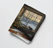 Un arbre de Noël magnifiquement décoré illumine la chaleur du salon, tandis qu'à l'extérieur, l'hiver se repose dans une beauté silencieuse. Un chat est assis sur le rebord de la fenêtre et contemple le paysage enneigé. Ce tableau évocateur allie convivialité, éclat festif et sérénité hivernale - un motif parfait pour la période contemplative de Noël.