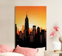 Célébrez la beauté envoûtante de la ligne d'horizon de la ville de New York se reflétant sur des eaux sereines. Cette œuvre d'art minimaliste capture les sites les plus emblématiques de la ville, tels que l'Empire State Building et le One World Trade Center, sur une riche toile de fond de teintes orange et violettes au coucher du soleil. Idéale pour les amateurs de décoration moderne, cette œuvre évoque la sophistication urbaine tout en conservant une esthétique tranquille et élégante.