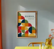 Affiche de l'exposition du Bauhaus de juillet-septembre 1919, richement colorée, présentant un motif complexe de quarts de cercle et de carrés. La composition utilise une palette audacieuse et accrocheuse de rouge, de bleu marine, de vert olive et de jaune/orange moutarde, qui remplit la moitié inférieure du cadre. Ce dessin abstrait géométrique illustre l'attachement du mouvement Bauhaus à la forme, à la théorie des couleurs et à la beauté fonctionnelle. Le texte "BAUHAUS" et "AUSSTELLUNG JUL-SEP 1919" apparaît clairement dans la partie supérieure. Cette impression numérique à haute résolution (7000x5000 pixels, 300 dpi) offre un niveau de détail supérieur et constitue un outil de travail parfait.