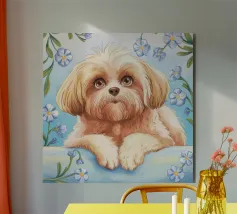 Cette œuvre d'art représente un nuage à l'air grincheux avec une bulle de pensée contenant un oiseau et un ours. La scène humoristique et imaginative se déroule sur un fond bleu doux.