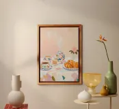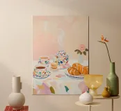 Illuminez votre espace avec cette charmante et fantaisiste nature morte impressionniste. L'œuvre capture un petit déjeuner ou un thé parisien accueillant, avec une théière fumante et des tasses assorties ornées d'un joyeux motif floral multicolore. La composition comprend des croissants fraîchement cuits, un macaron à la framboise et une délicate rose, le tout sur un fond apaisant rose et crème. Les coups de pinceau visibles donnent à la pièce une texture douce et picturale et une élégance douillette. Cet achat correspond à un fichier d'affiche numérique de qualité supérieure (7000x5000 pixels, 300 dpi), garantissant un rendu irréprochable et sans fioritures.