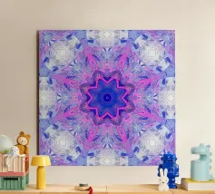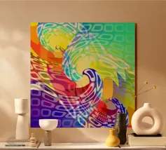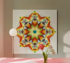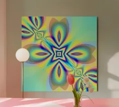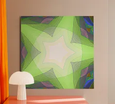 Kaléidoscope avec formes décorées dans les tons vert-jaune-bleu alu dibond