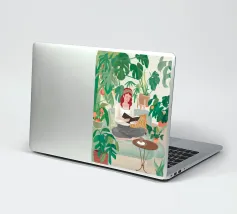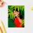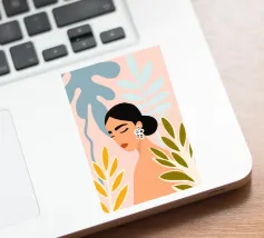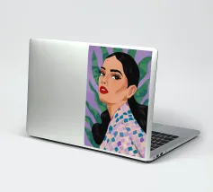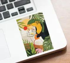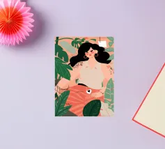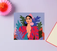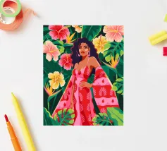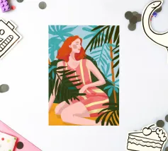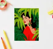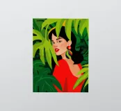 Une mystérieuse femme en rouge apparaît derrière un feuillage tropical luxuriant, créant ainsi un contraste et une intrigue.