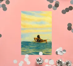 Marta a apporté un beignet jaune à l'océan et l'a déclaré nation souveraine. Pendant trois heures de bonheur, elle a régné avec des lunettes de soleil surdimensionnées et un maillot de bain rayé qui avait connu plus de festivals d'été qu'une pop star à la retraite. Pas de gens, pas de bruit, seulement des mouettes polies et une excellente flottabilité. Peinture originale d'une femme seule dérivant sur un donut jaune vif flottant sur une mer vaste, calme et sarcelle. Un maillot de bain à rayures vintage, un large chapeau de soleil et des lunettes de soleil rondes donnent à la femme un air rétro et enjoué, tandis que l'espace négatif abondant et la texture douce créent une composition calme et aérée.