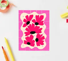 Plongez dans un monde d'abstraction fantaisiste avec cette captivante impression d'art "Blob Flower". Le motif représente une grande fleur stylisée aux pétales irréguliers et organiques dans des tons vibrants de rose et d'orange, rayonnant à partir d'une tache centrale bleue. Entourée de formes abstraites complémentaires plus petites et de contours subtils, l'œuvre dégage une énergie ludique, fluide et nettement psychédélique. Cette impression est parfaite pour ajouter une touche d'intrigue artistique et de charme rétro à tout espace contemporain ou éclectique. Cet art numérique de haute qualité est présenté dans une résolution étonnante de 7000x5000 pixels à 300 dpi, ce qui permet à l'artiste de s'approprier l'œuvre d'art.