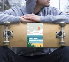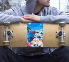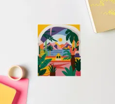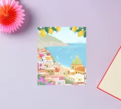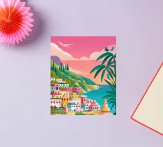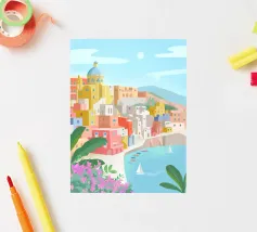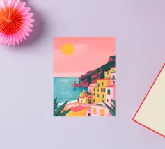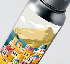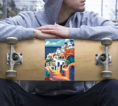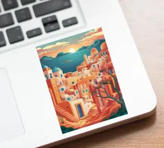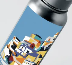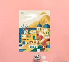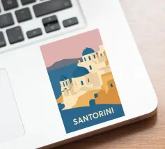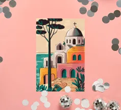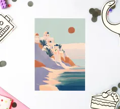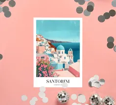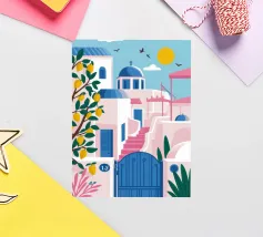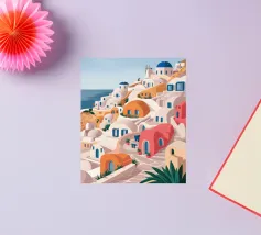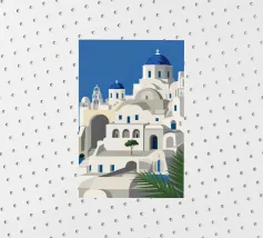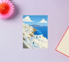 Illustration pittoresque des bâtiments blancs et des dômes bleus emblématiques d'une île grecque, probablement Santorin, surplombant la mer. La scène est une représentation parfaite, baignée de soleil, d'un paradis méditerranéen.