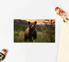 Un ours brun se repose paisiblement parmi les hautes herbes dans un cadre serein, se prélassant dans la douce lumière du matin, entouré par la beauté de la nature.