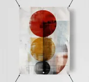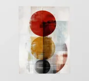 Une œuvre d'art abstraite audacieuse composée de trois grands cercles empilés verticalement dans des couleurs rouge foncé, jaune doré et noir. Les couches texturées et les fins détails linéaires créent de la profondeur et du mouvement, tandis que le fond neutre apporte de l'équilibre. Cette composition saisissante allie un design moderne à une touche rétro, ce qui en fait une pièce de choix pour les intérieurs contemporains, industriels ou éclectiques.
