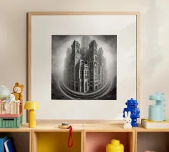 Cette image présente une architecture circulaire complexe avec des colonnes de pierre ornées, une statue centrale et un plafond de verre. La perspective surréaliste crée un effet de tunnel, attirant l'œil vers le centre de la composition.