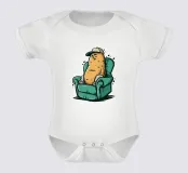 Illustration de bande dessinée d'un personnage de pomme de terre portant une casquette, confortablement installé dans un fauteuil vert sur un fond orange vif. La pose décontractée et les détails expressifs traduisent l'humour et la paresse dans un dessin plein d'entrain.
