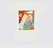 This artwork shows a person with blonde hair looking into a vanity mirror. The background is filled with floral wallpaper, and the vanity table is adorned with various items, creating a nostalgic and intimate scene.