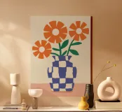 Une nature morte ludique et graphique de marguerites orange vif dans un vase à carreaux bleu et blanc. La composition simple et les motifs audacieux créent une illustration florale moderne et énergique.