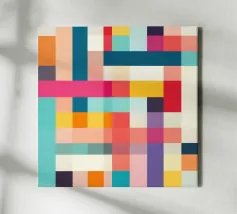 An abstract composition features a series of geometric shapes and bold, vibrant colors arranged in a grid pattern. Distinctive blocks of color are interspersed with linear elements, creating a visually dynamic and modern design.