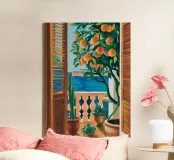 Une vue à travers une fenêtre d'un magnifique oranger, chargé de fruits mûrs. La lumière chaude et ensoleillée et le sujet charmant créent une scène d'abondance rustique et méditerranéenne.