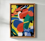 Une œuvre d'art abstraite énergique où des formes audacieuses aux couleurs primaires de rouge, de bleu et de jaune s'entrechoquent et se chevauchent. La composition est dynamique et ludique, avec un fort impact graphique qui rappelle les maîtres modernes.