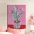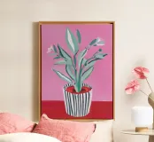 Illustration joyeuse d'un bouquet de fleurs roses et blanches dans un pot amusant à rayures roses et blanches, créant une pièce botanique simple, fraîche et joyeuse.