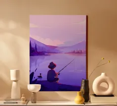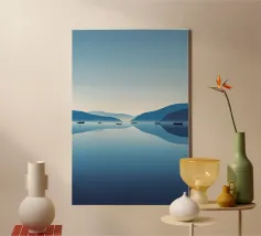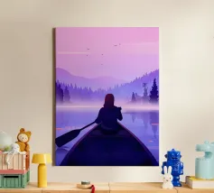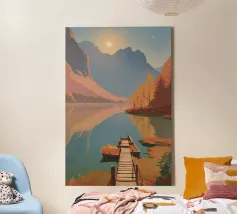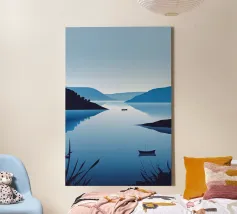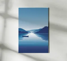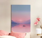 Une douce barque dérive sur des eaux miroitantes, baignées de teintes oniriques de rose et de lilas. Des montagnes étagées s'estompent au loin sous un soleil paisible, évoquant un sentiment de connexion tranquille et de temps suspendu. Une composition poétique sur l'immobilité, la nature et le calme émotionnel.