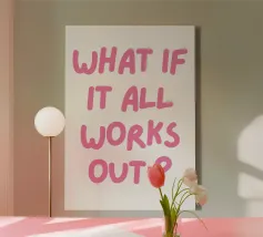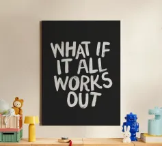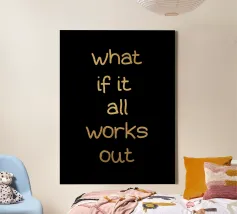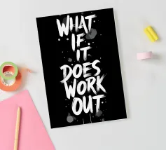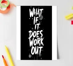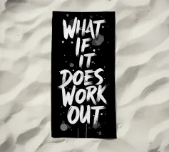 Cet art numérique saisissant présente la phrase puissante et optimiste "WHAT IF IT DOES WORK OUT" en caractères blancs gras et texturés sur un fond noir. Le style du coup de pinceau donne au texte un aspect dynamique et peint à la main, tandis que des points blancs épars et de subtiles éclaboussures d'encre grise ajoutent de la profondeur et de l'intérêt visuel. Cette œuvre est une source d'inspiration qui nous rappelle qu'il faut garder espoir et envisager des résultats positifs.