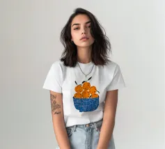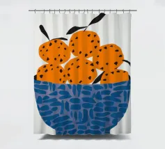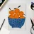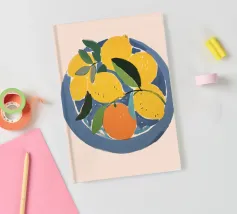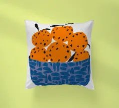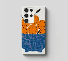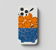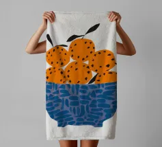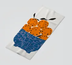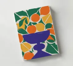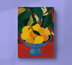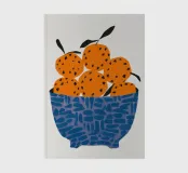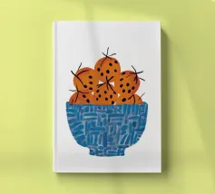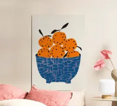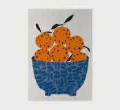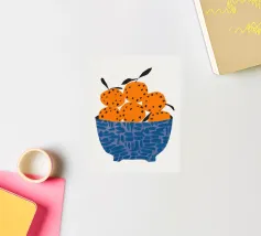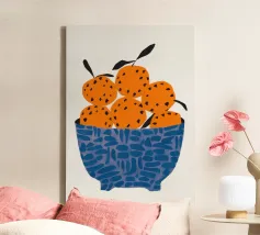 Illustration graphique et texturée d'un bol à motifs bleus débordant d'oranges éclatantes. La simplicité de la composition met l'accent sur les couleurs vives et la texture des fruits, ce qui en fait une œuvre fraîche et moderne.