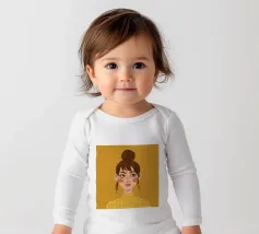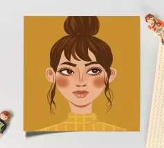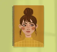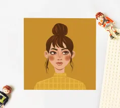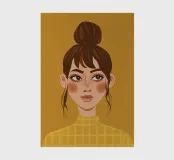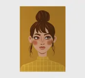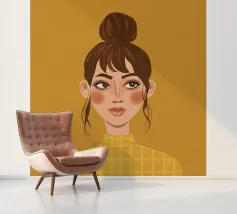 Portrait doux et chaleureux d'une jeune femme aux cheveux en chignon désordonné et portant un col roulé jaune. Son regard direct et doux et l'arrière-plan chaud jaune moutarde créent une atmosphère intime et accueillante.