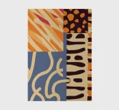 Une œuvre d'art abstraite composée de divers patchs texturés, y compris des imprimés d'animaux et des couleurs unies comme l'orange et le bleu, créant un patchwork moderne visuellement intéressant et harmonieux.