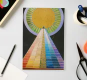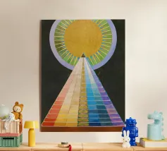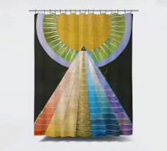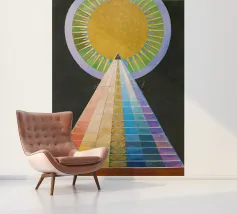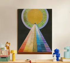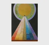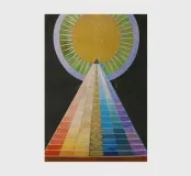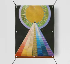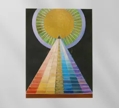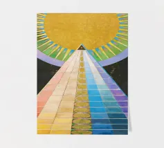 Le retable n° 1 est un spectacle époustouflant de précision géométrique et de symbolisme spirituel. En son cœur se trouve un triangle doré ascendant - la "pyramide" - recouvert de bandes rythmiques aux couleurs de l'arc-en-ciel qui représentent le spectre de l'évolution humaine et spirituelle. Surmontée d'un disque rayonnant en forme de soleil, la composition symbolise le voyage ascendant vers la lumière divine et l'unité de toute existence. Il s'agit sans doute de l'une des images les plus emblématiques de l'histoire de l'art, représentant un moment où l'abstraction a été utilisée pour combler le fossé entre le terrestre et le transcendant.