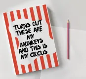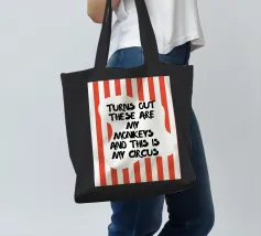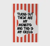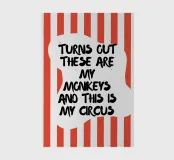 Imprimé humoristique avec le slogan "Turns out these are my monkeys and this is my circus" - texte noir sur fond rayé rouge et blanc. Parfait comme cadeau amusant, décoration murale pour le bureau ou la maison. Idéal pour les fans de sarcasme et de chaos.