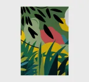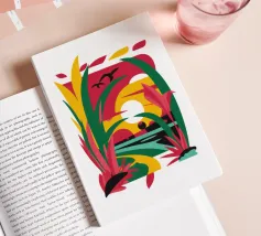 Un paysage abstrait est déconstruit en formes géométriques et en couleurs vives, représentant un soleil, des collines et des feuillages dans une composition fragmentée mais harmonieuse sur un fond sombre.