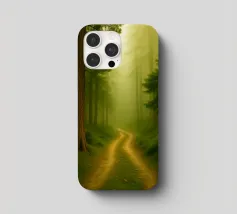 Un sentier forestier serein, enveloppé de brume, est bordé de grands arbres qui se dressent majestueusement. Une lumière douce traverse la canopée, créant une atmosphère tranquille.