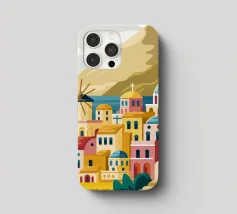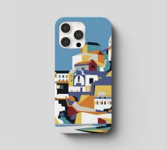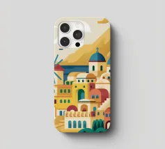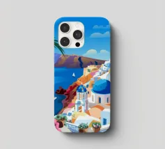 Illustration pittoresque des bâtiments blancs et des dômes bleus emblématiques d'une île grecque, probablement Santorin, surplombant la mer. La scène est une représentation parfaite, baignée de soleil, d'un paradis méditerranéen.