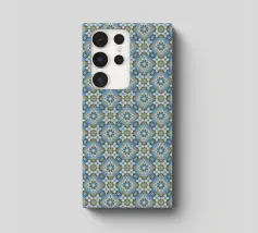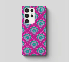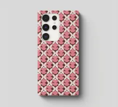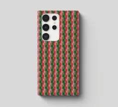A seamless pattern featuring red and green floral motifs arranged diagonally on a light background. The design is symmetrical, creating a harmonious and repeating geometric structure.