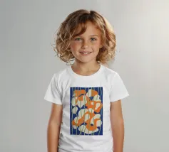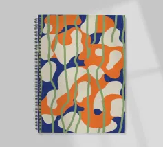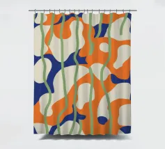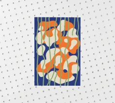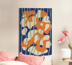 Cette œuvre d'art abstraite dynamique présente des formes fluides et organiques dans des tons d'orange vif, de blanc pur et de bleu froid. Sur un fond sombre, les formes semblent flotter et interagir, suggérant le mouvement et une élégance moderne et biomorphique.