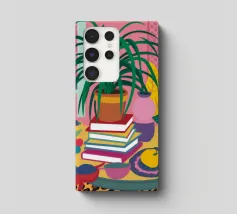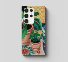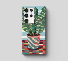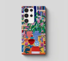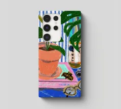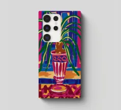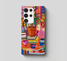 Nature morte d'une plante en pot et d'autres objets posés sur une table avec un tapis coloré à motifs en dessous. La composition sur un mur rose est moderne, éclectique et pleine de détails décoratifs charmants.