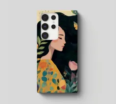 A portrait of a woman with flowing red hair, surrounded by stylized leaves and flowers, looking thoughtfully to the side. The style is modern, bold, and slightly art nouveau.